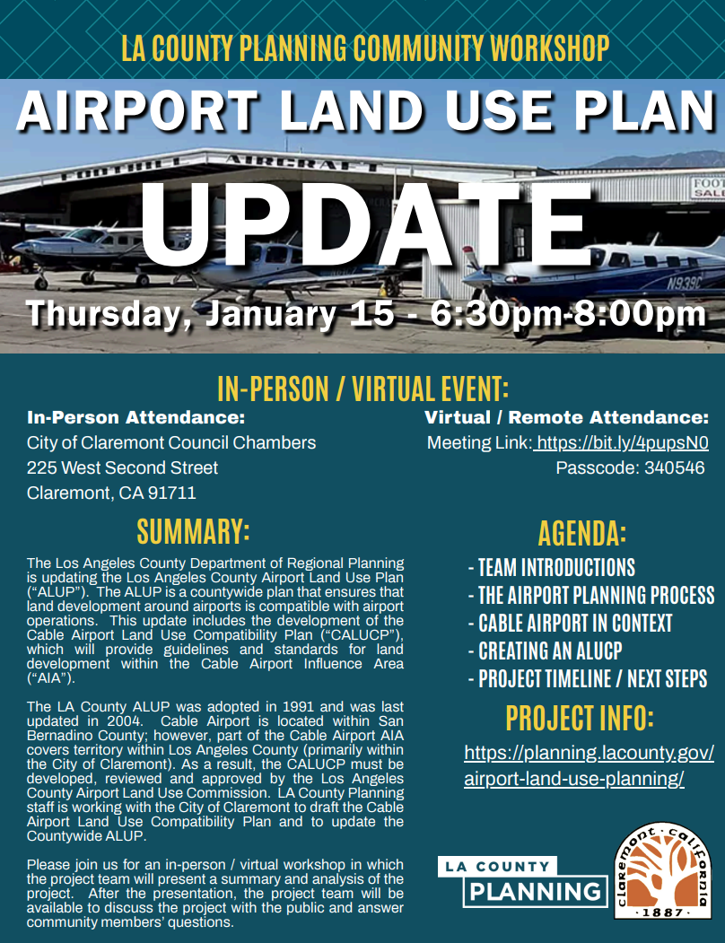 The Los Angeles County Department of Regional Planning is updating the Los Angeles County Airport Land Use Plan (“ALUP”). The ALUP is a countywide plan that ensures that land development around airports is compatible with airport operations. This update includes the development of the Cable Airport Land Use Compatibility Plan (“CALUCP”), which will provide guidelines and standards for land development within the Cable Airport Influence Area (“AIA”).