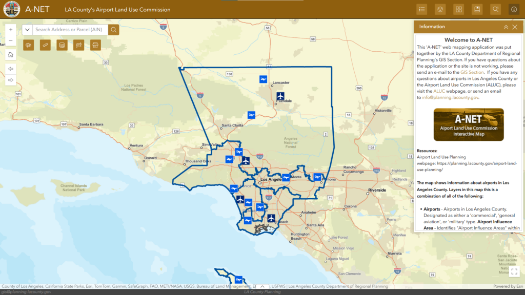 The Airport Land Use Commission viewer, or A-NET, provides layers associated with ALUC, including airport locations, airport Influence areas, runway protection zones, noise contours, etc. You can view the layers over aerial imagery or other basemaps. Visit the ALUC webpage for more information.